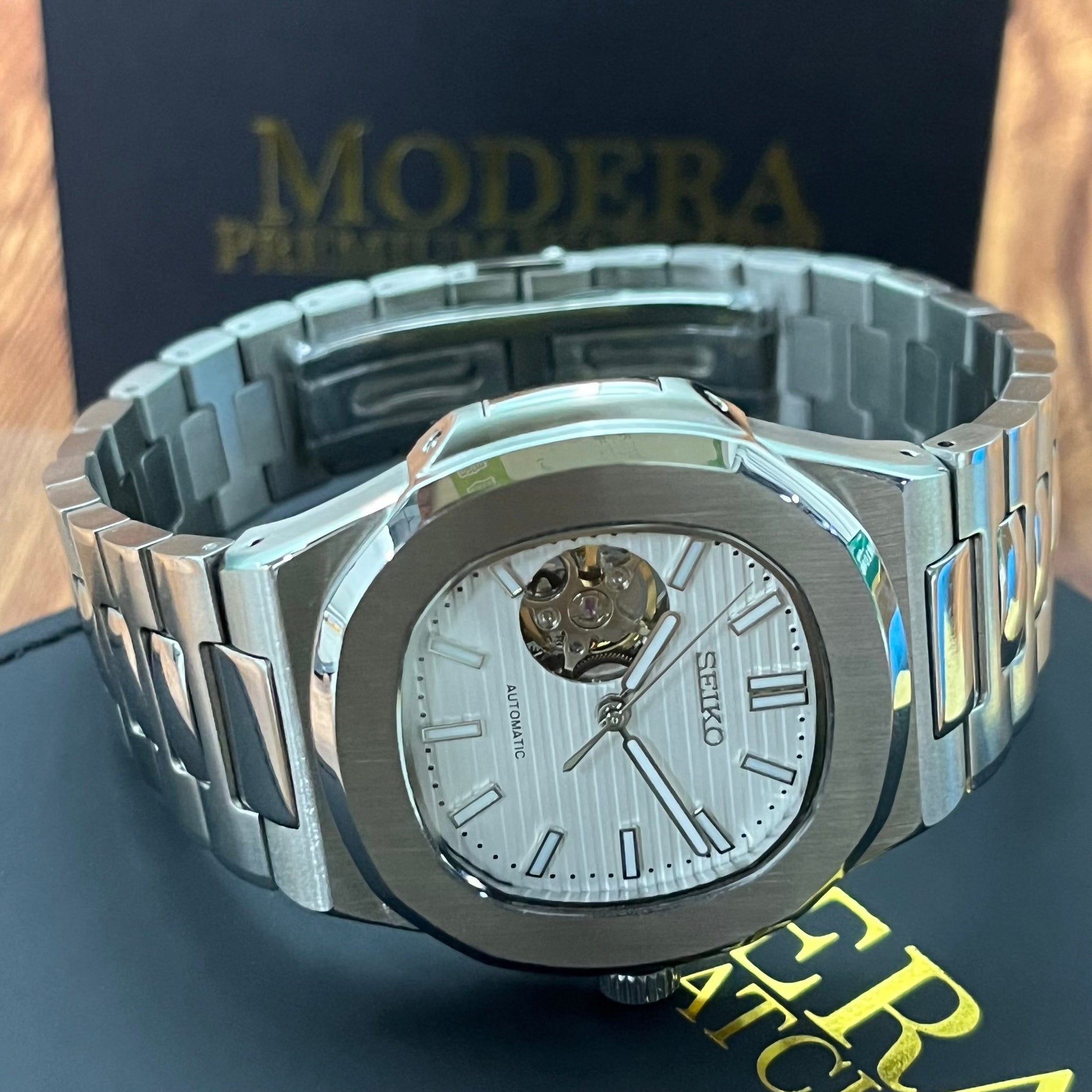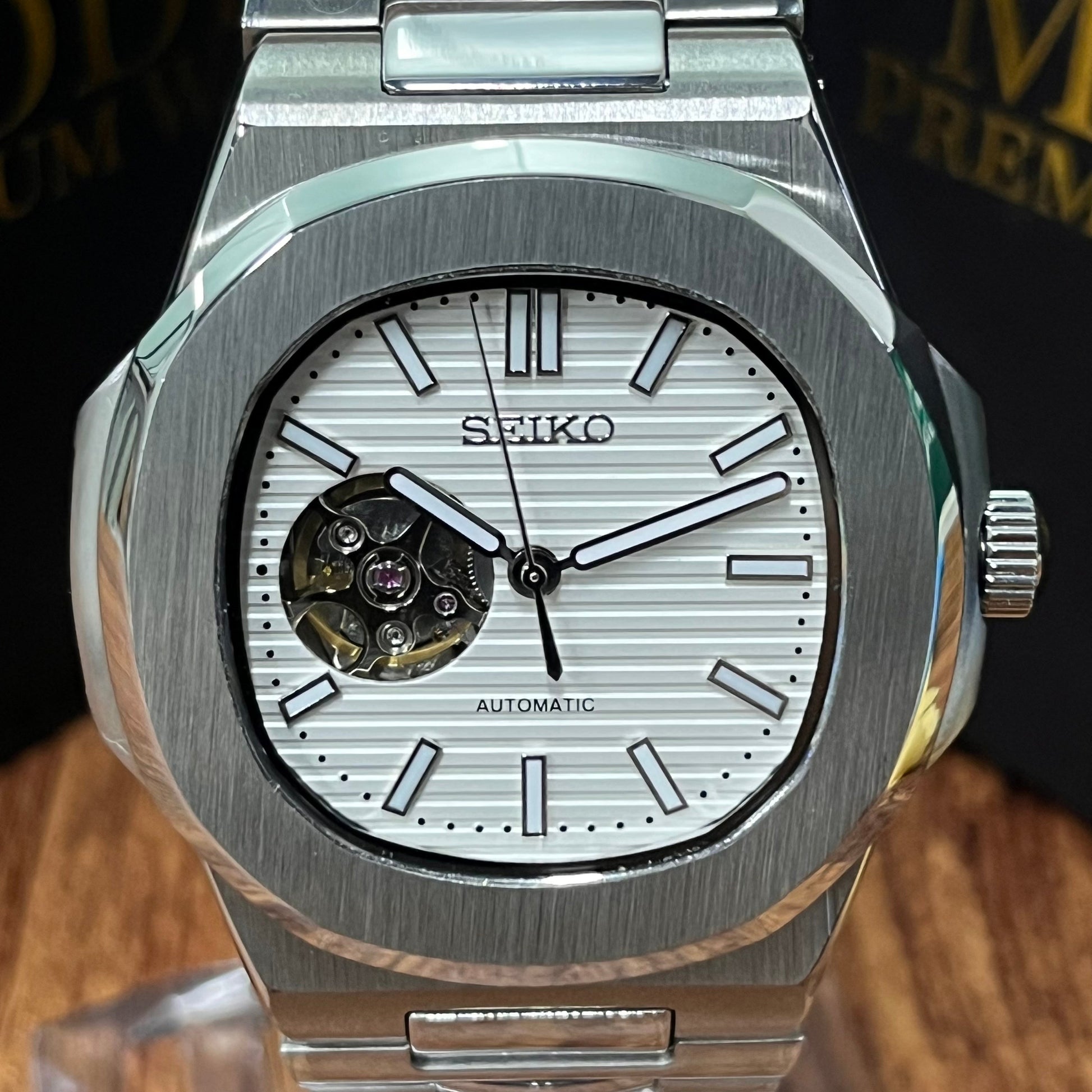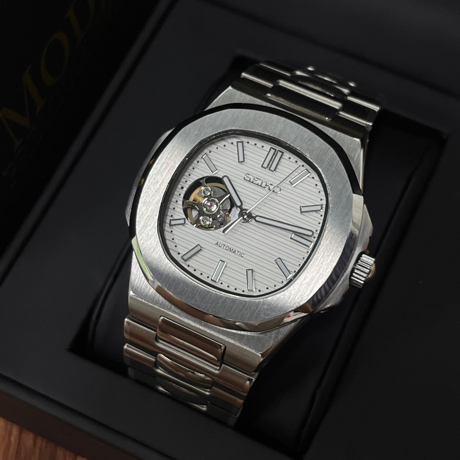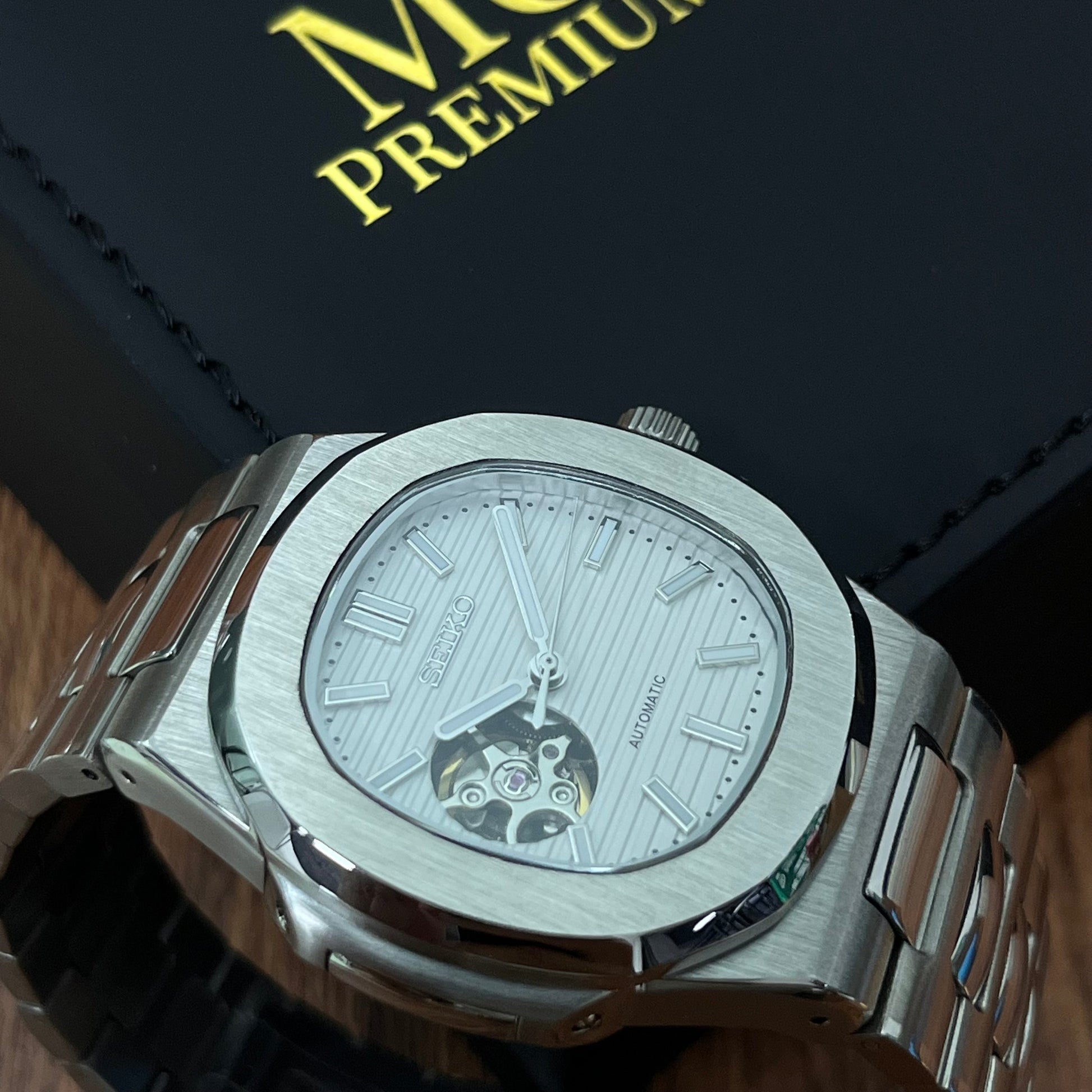 Inspired by the iconic Nautilus design, and featuring the prestigious Seiko NH38 automatic movement, we present the Seiko Mod Nautilus. A 41 mm high-end quality watch combining the perfect alliance between excellence and accessibility.