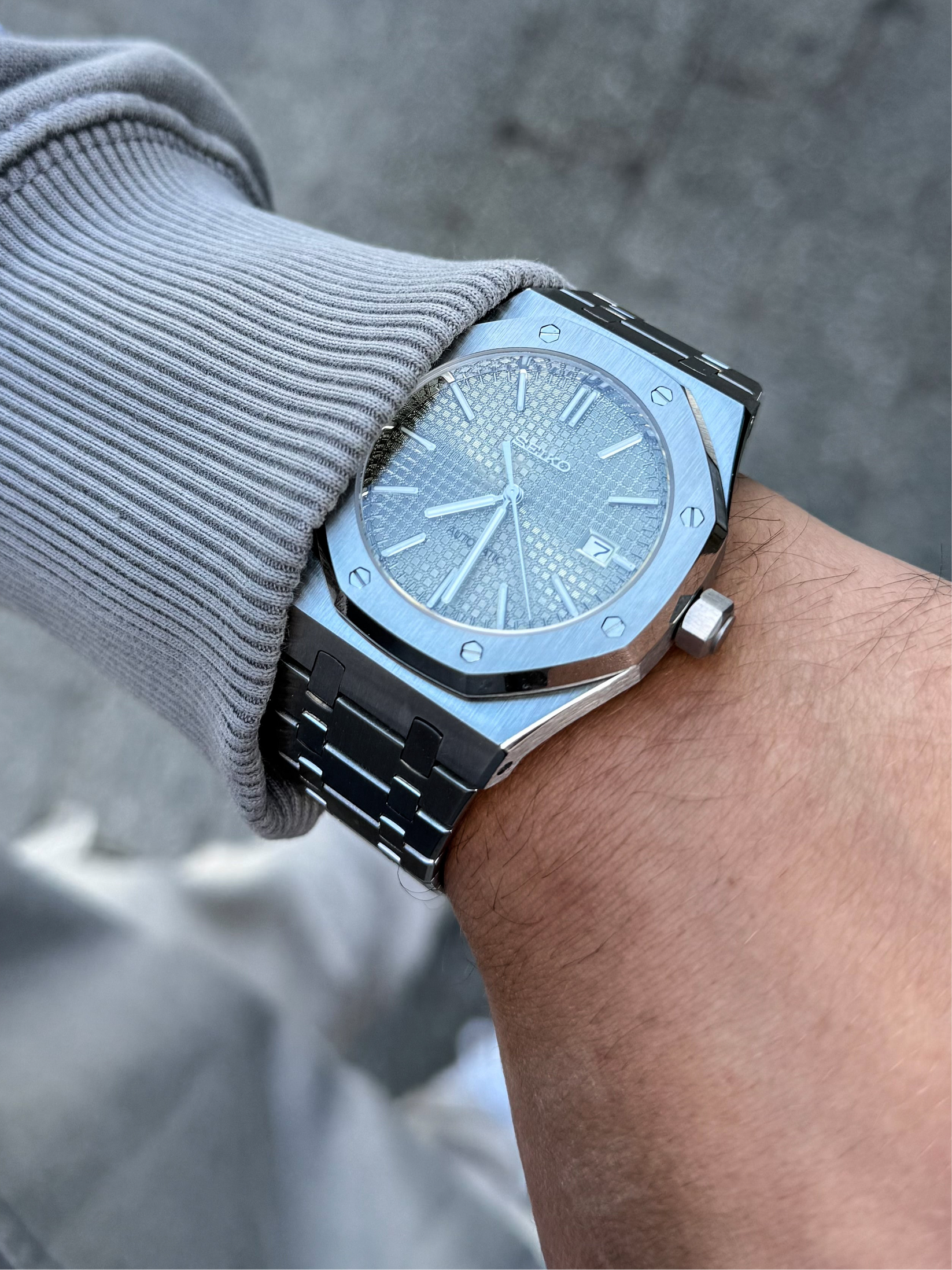 Inspired by the iconic Royal Oak design, and featuring the prestigious Seiko NH35 automatic movement, we present the Seiko Mod Royal Oak. A 41 mm high-end quality watch combining the perfect alliance between excellence and accessibility.