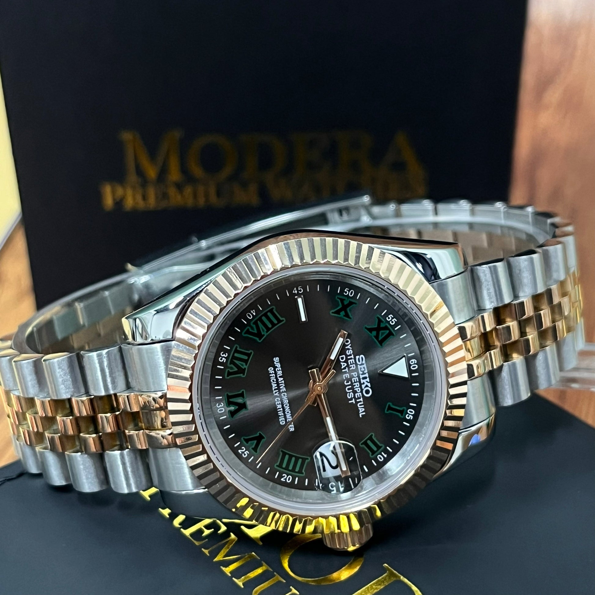 Inspired by the iconic Datejust design, and featuring the prestigious Seiko NH35 automatic movement, we present the Seiko Mod Datejust. A 36 / 39 mm high-end quality watch combining the perfect alliance between excellence and accessibility.