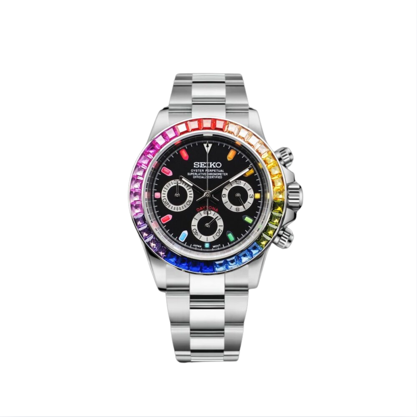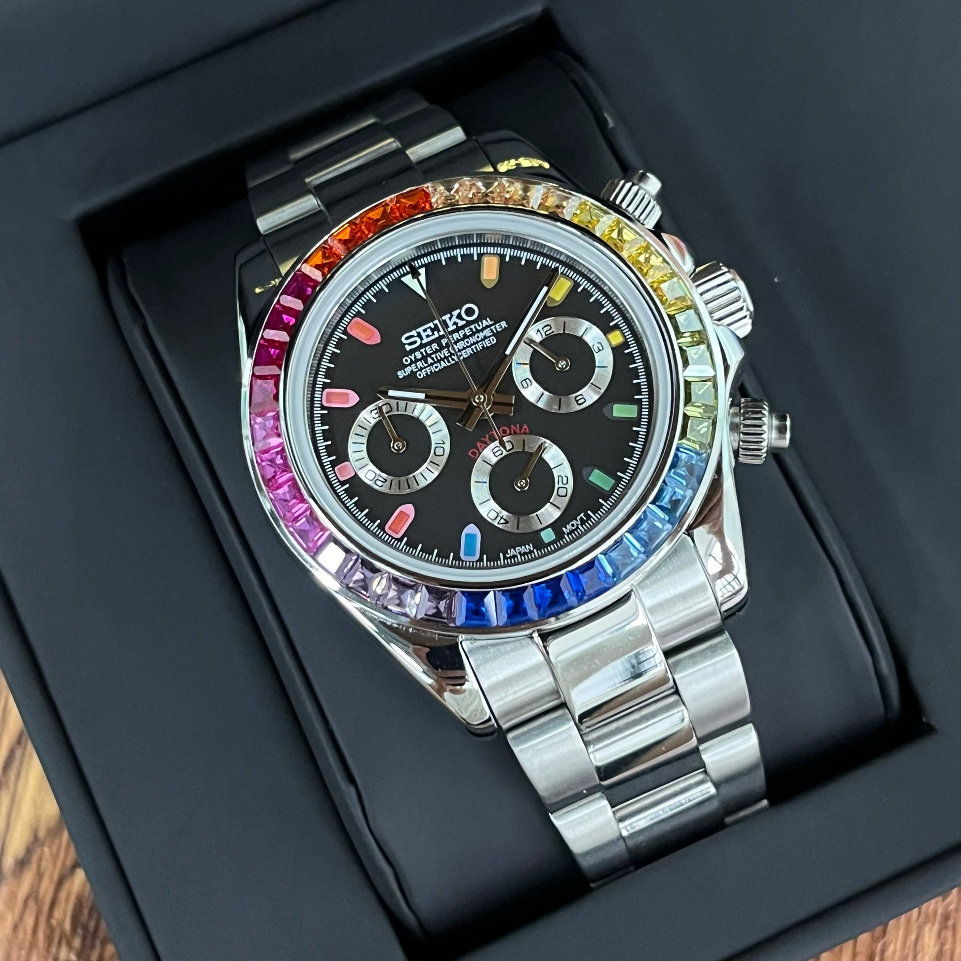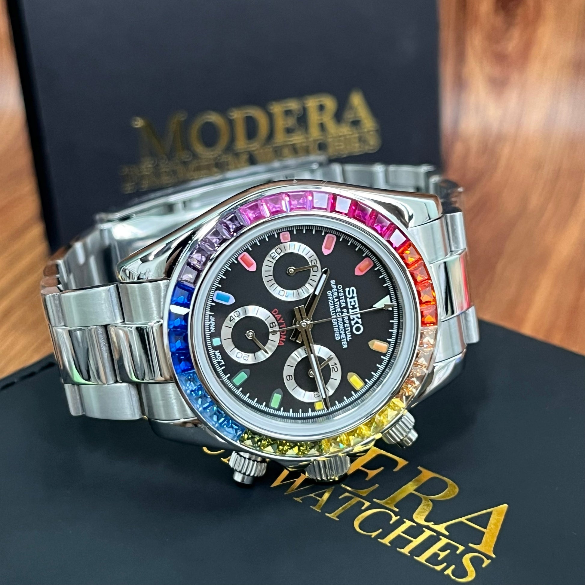 Inspired by the iconic Daytona design, and featuring the prestigious Seiko VK63 hybrid movement, we present the Seiko Mod Daytona. A 40 mm high-end quality watch combining the perfect alliance between excellence and accessibility.